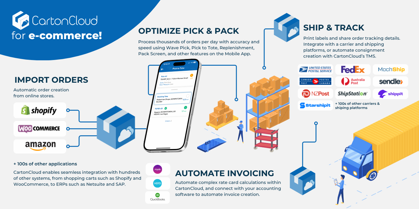 Welcome to end-to-end e-commerce fulfilment, without friction. CartonCloud’s e-commerce suite gives you the power to deliver high-volume e-commerce fulfillment with tailored workflows designed to suit a range of inventory and client needs, along with our custom automation and intuitive design that you, your team, and your customers know and love.