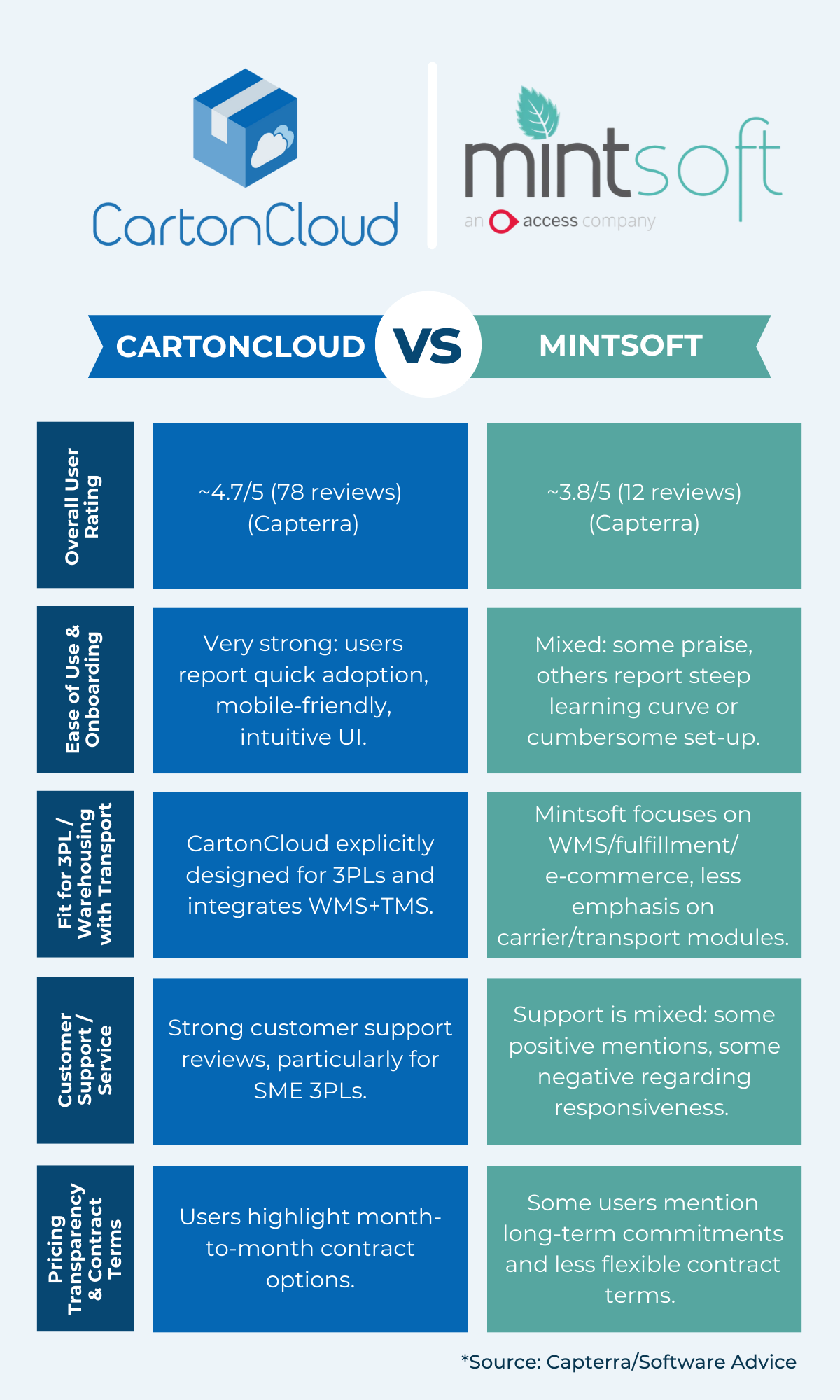 - CartonCloud is easier for warehouse teams to learn and use. With a 4.8–4.9/5 ease-of-use rating and intuitive mobile workflows, CartonCloud helps teams move faster and train quicker, especially during peak periods. Mintsoft receives mixed usability feedback, with several users calling out manual steps and CSV-heavy workflows that slow operations down.