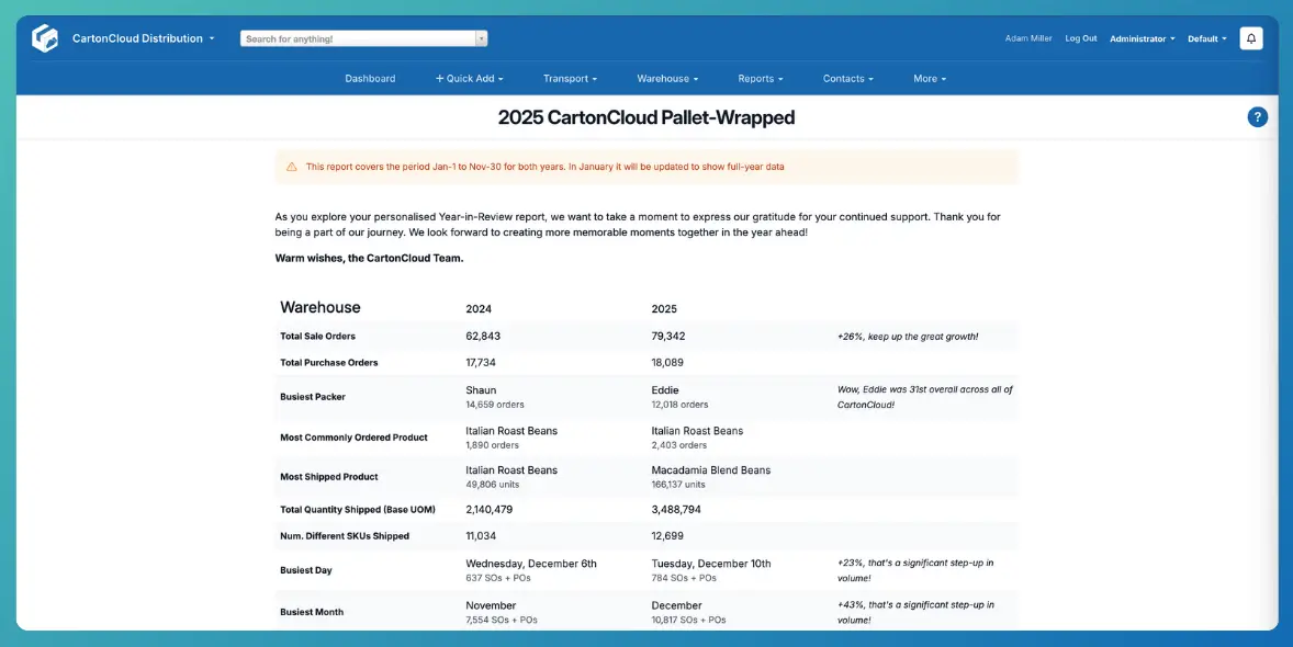 You can also take advantage of CartonCloud’s automatically generated Pallet Wrapped Report, which appears on your dashboard each year. It gives you a snapshot of your 3PL’s annual performance, including insights like your most commonly ordered product, helping you to plan for the next year and make any necessary changes to your warehouse space if required.