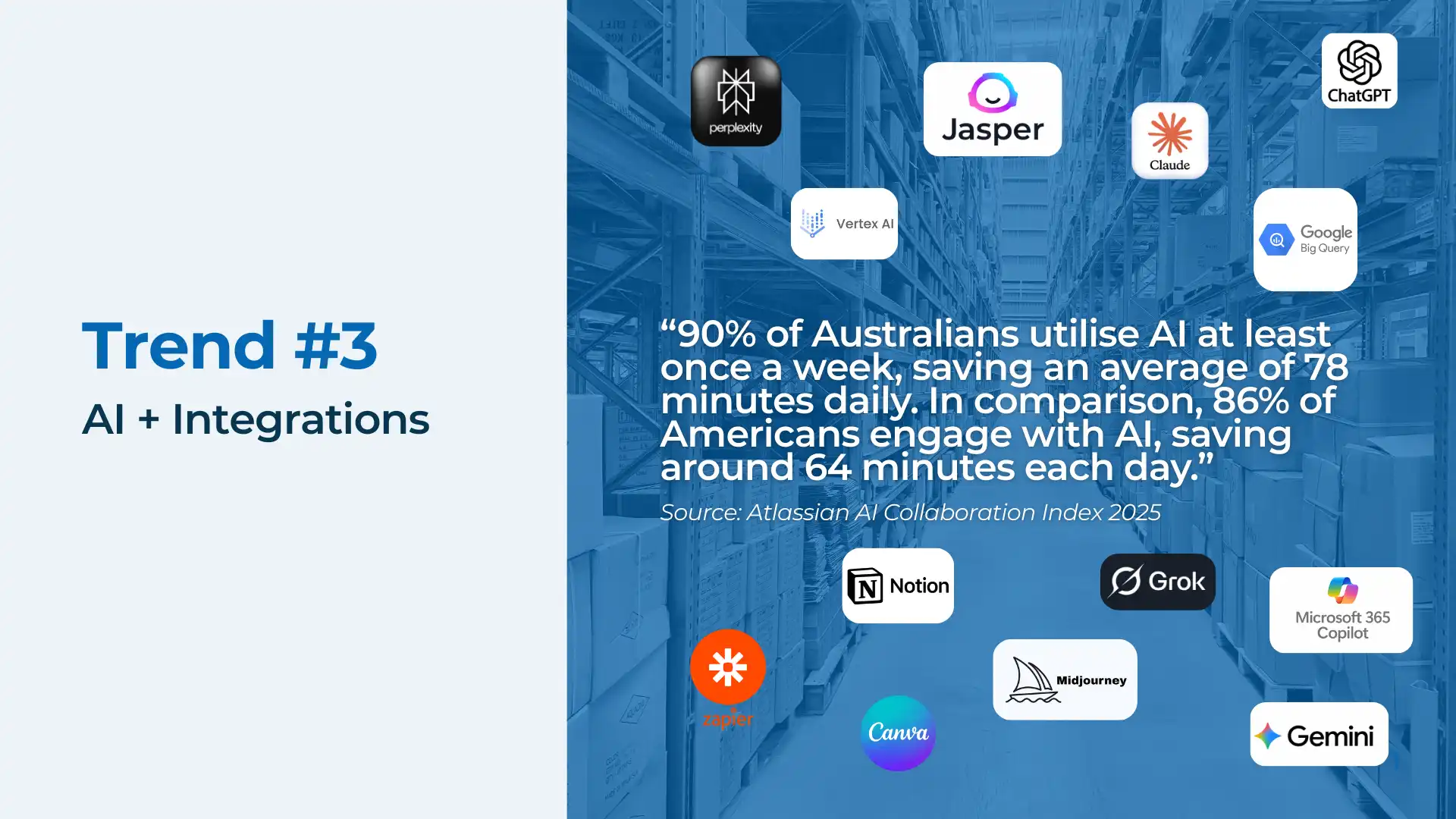 According to the Atlassian AI Collaboration Index (2025), 90% of Australians utilise AI at least once a week, saving an average of 78 minutes daily. In comparison, 86% of Americans engage with AI, saving around 64 minutes each day.