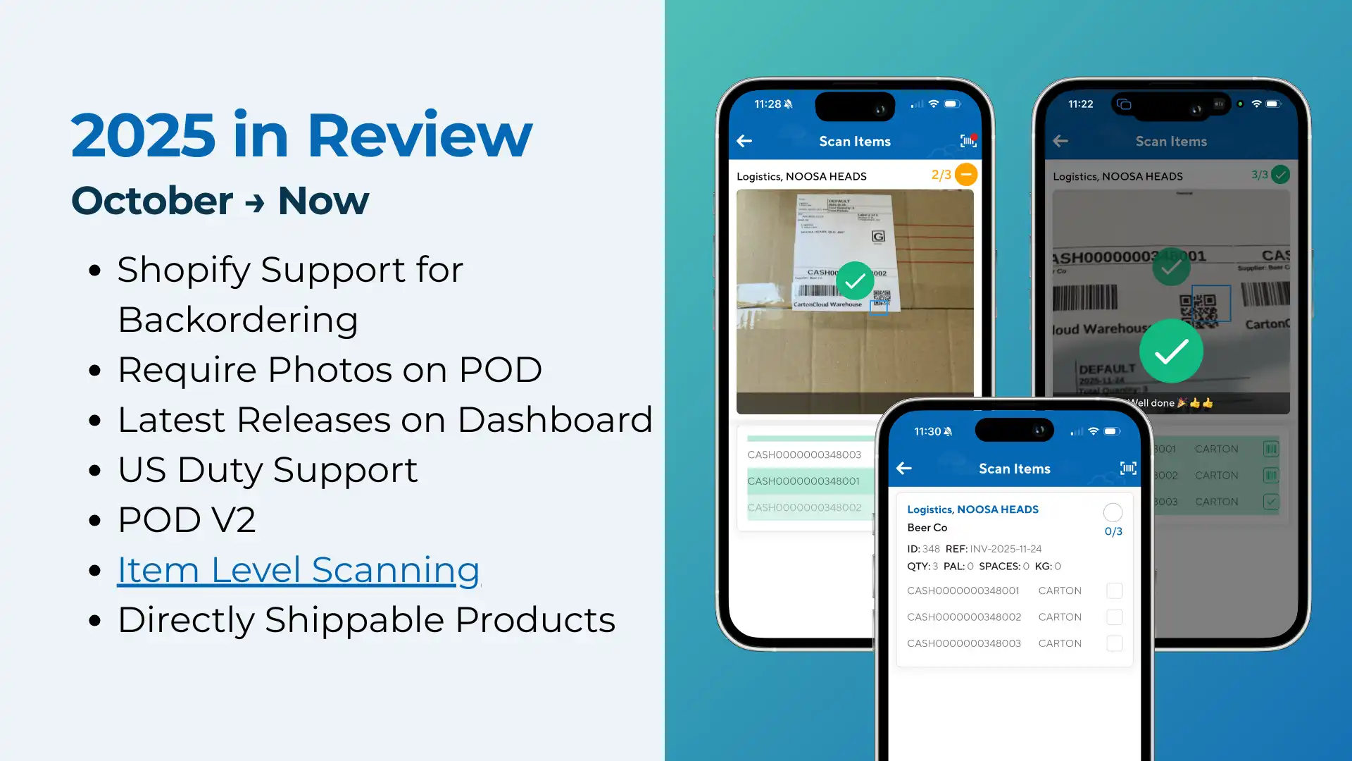 A key highlight for CartonCloud’s TMS in 2025 was Item-level Scanning, improving delivery accuracy, visibility, and proof of execution at the item level for teams.