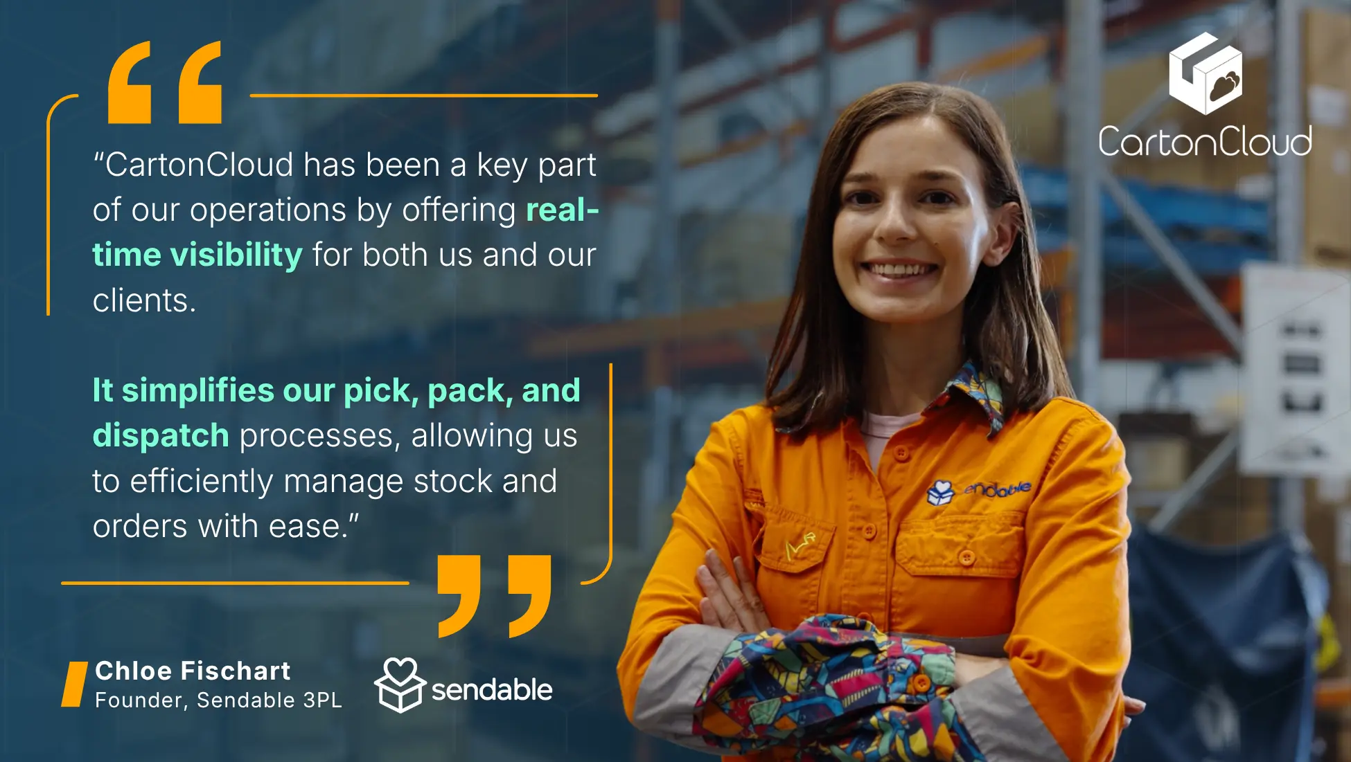 “CartonCloud has been a key part of our operations by offering real-time visibility for both us and our clients. It simplifies our pick, pack, and dispatch processes, allowing us to efficiently manage stock and orders with ease.” — Chloe Fischart, Founder, Sendable 3PL