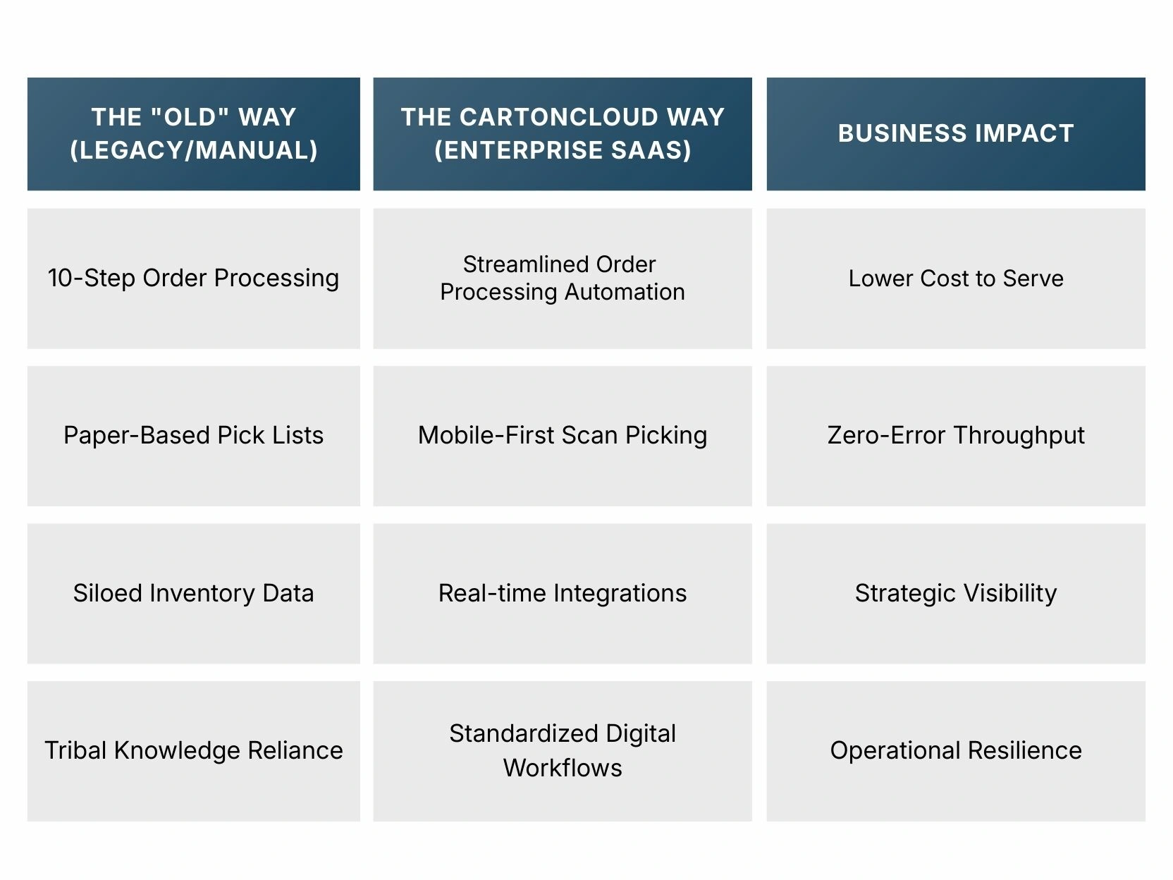 These are the manual steps that once made sense: spreadsheets passed between teams, paper-based pick slips, re-keying data from one system into another. Individually, they feel manageable. Collectively, they add a hidden “manual tax” to every order that moves through the business.